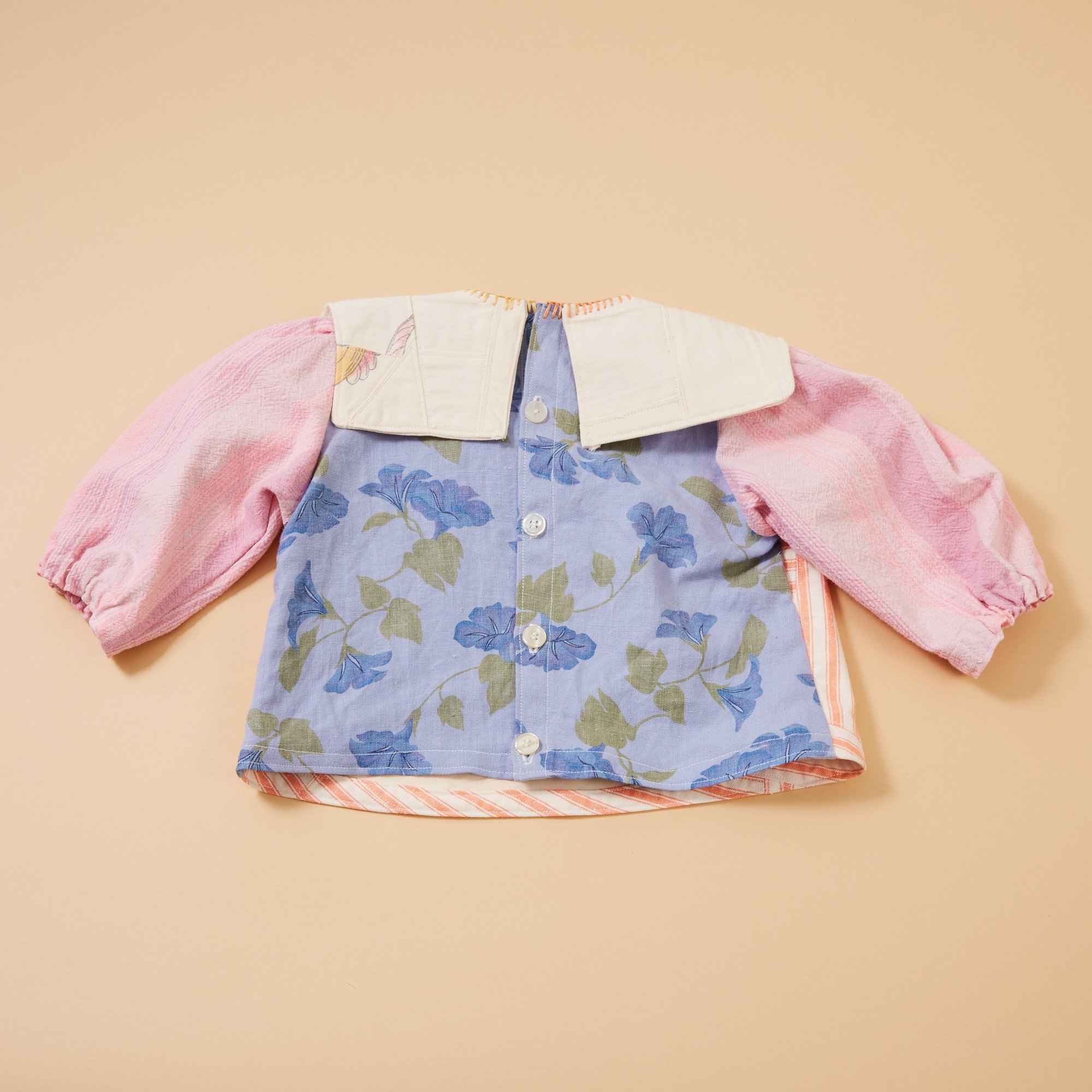 Hand sewn a-line blouse with balloon sleeves and elastic cuffs.Made from a combination of vintage cotton table cloths with hand sewn embroidery around the neckline.