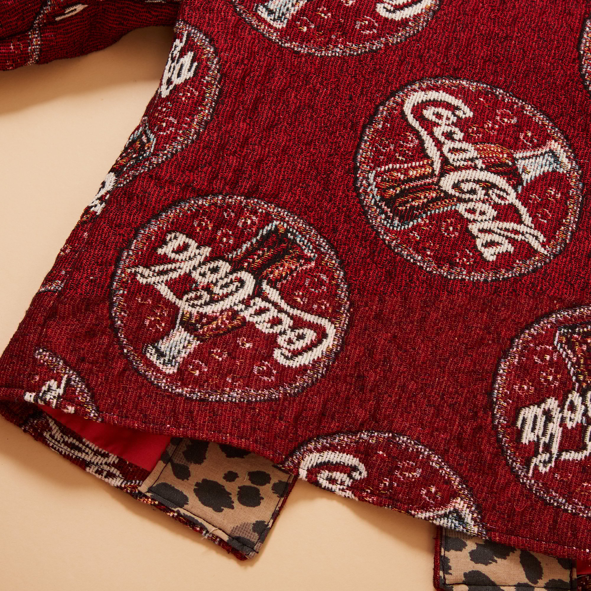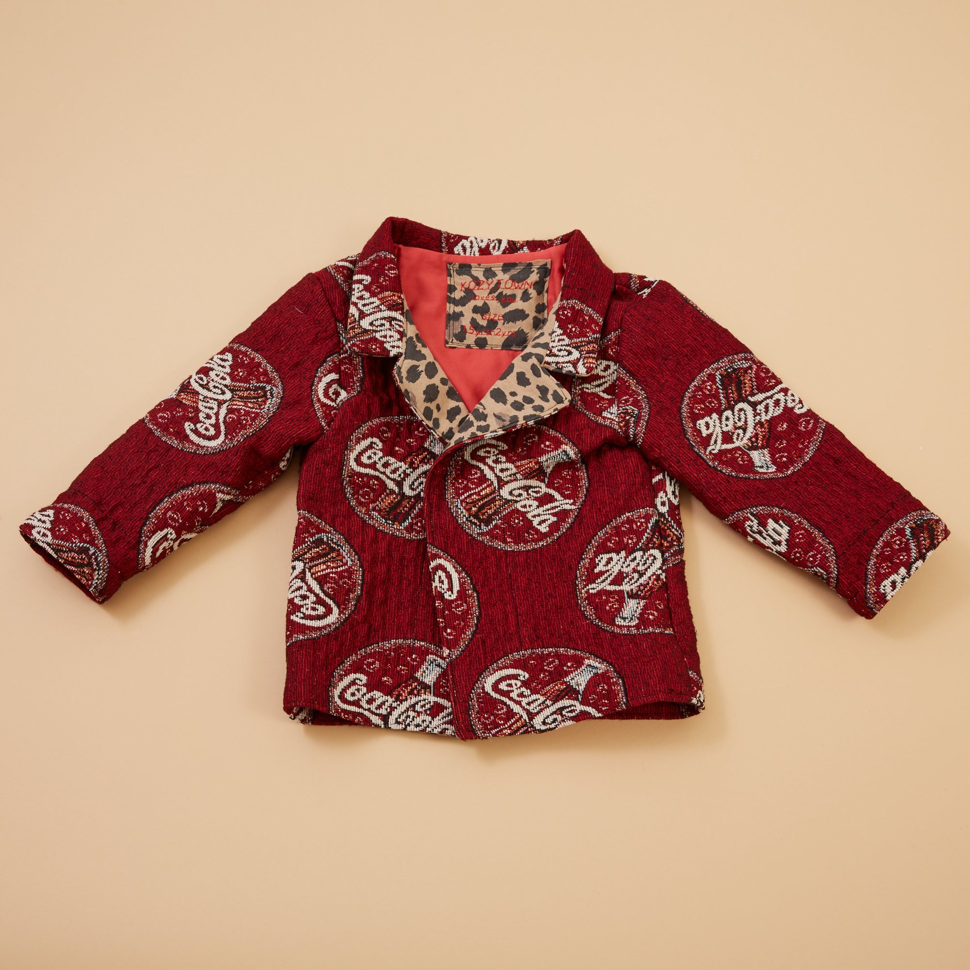 Hand sewn trucker jacket made from vintage Coca-Cola woven jacquard fabric. Fully lined with vintage fabric and cheetah trim detailing.